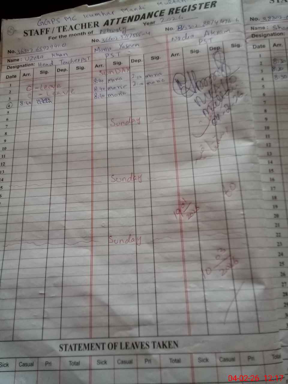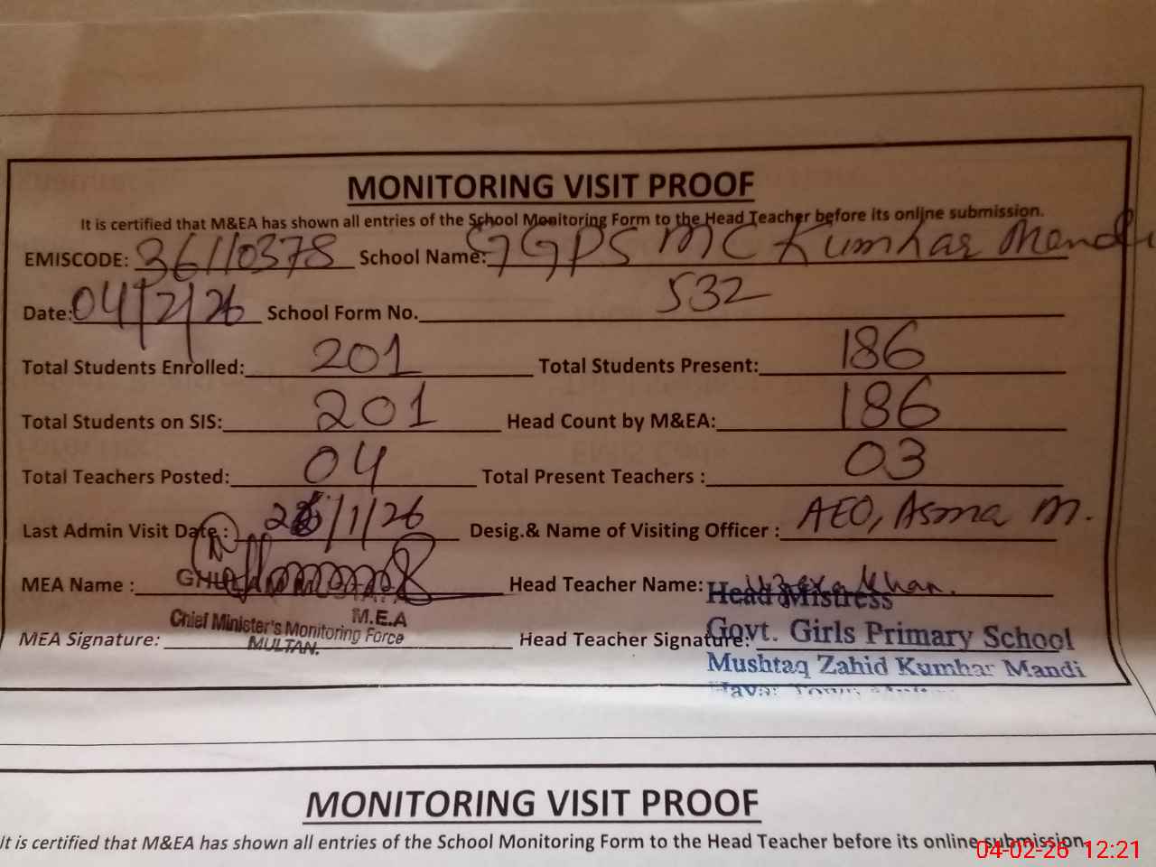 | EMIS Code: 36110378 | Name of School: GGPS MC KUMHAR MANDI WALAYAT ABAD NO.1 MULTAN | |||