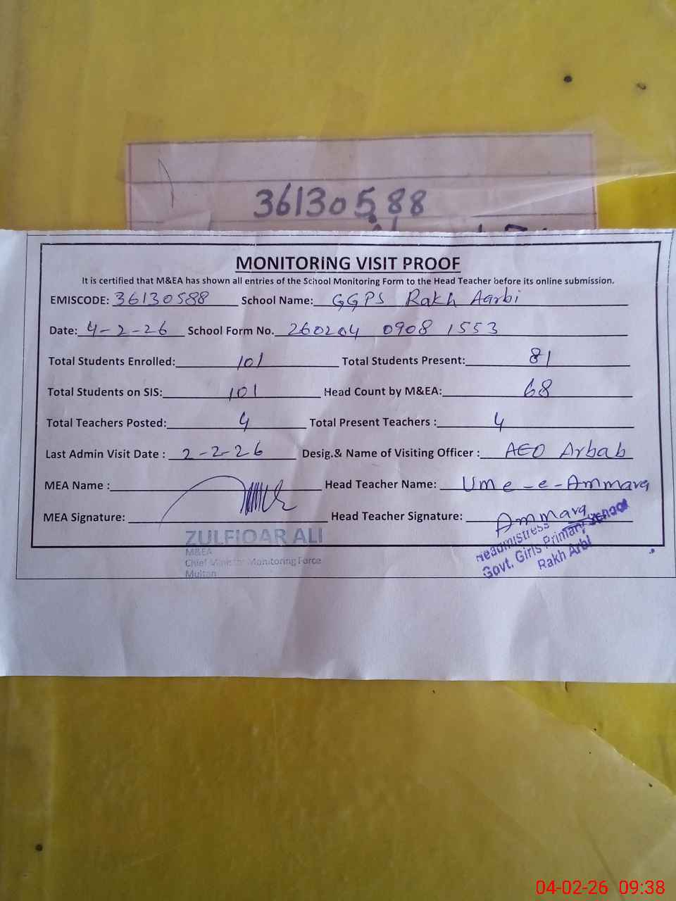 | Attendance Register | Head Teacher | MEA with School | Visit Proof |