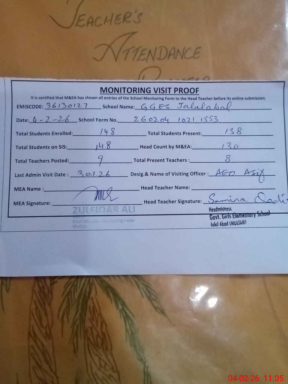 | Attendance Register | Head Teacher | MEA with School | Visit Proof |