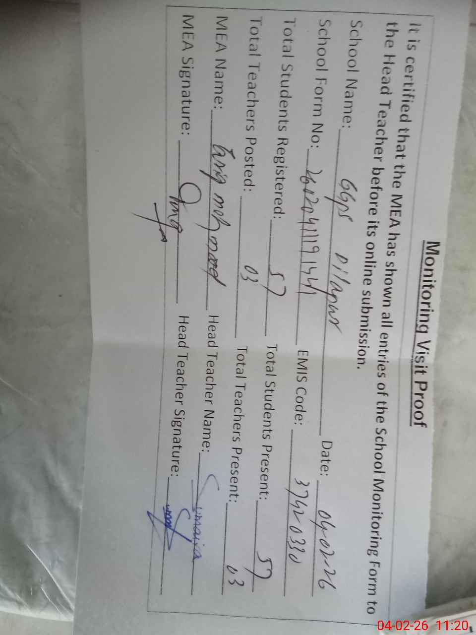 | Attendance Register | Head Teacher | MEA with School | Visit Proof |