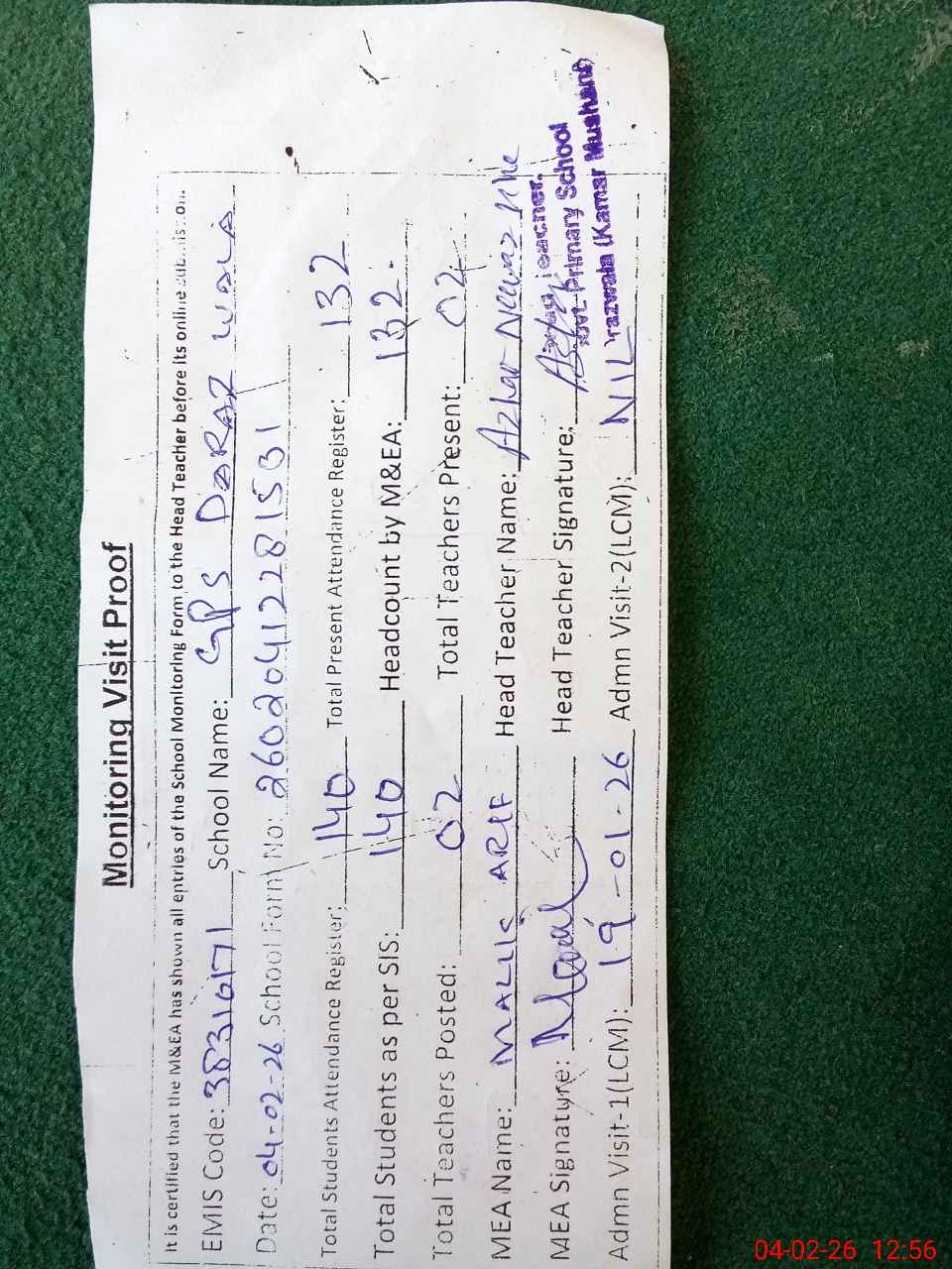 | Attendance Register | Head Teacher | MEA with School | Visit Proof |
