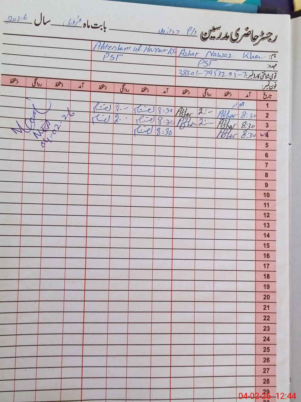 | Name: Az**** Na**** Kh**** Designation: (School Headmaster's/Headmistress's) PST Phone/Cell Number: 03**** |