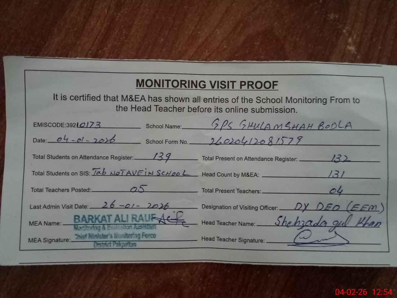 | EMIS Code: 39210173 | Name of School: GPS GHULAM SHAH BODLA PO PAKPATTAN | |||