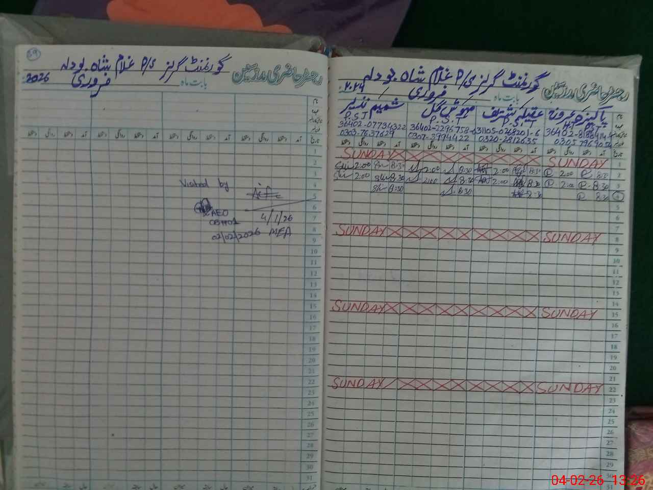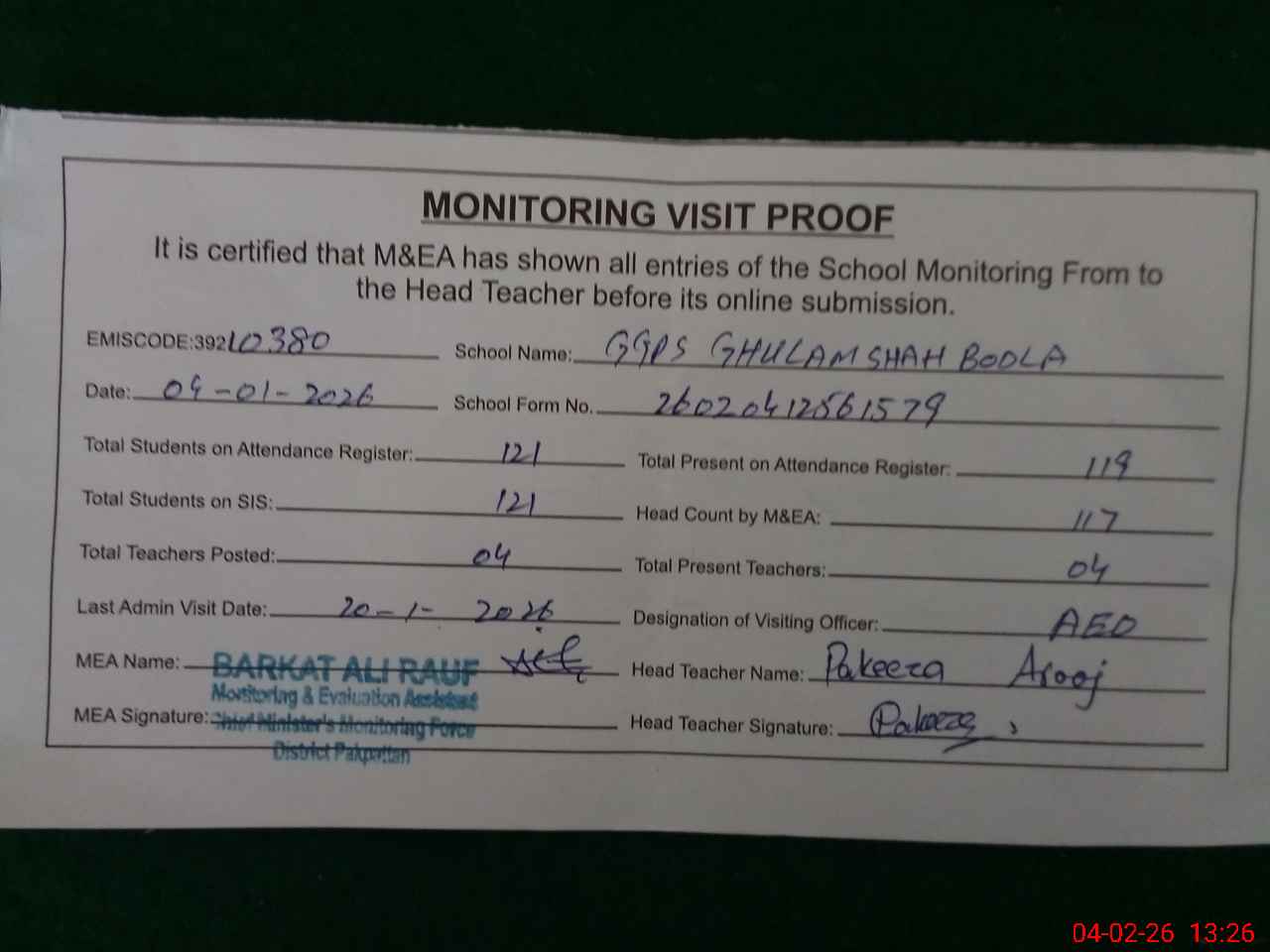 | Attendance Register | Head Teacher | MEA with School | Visit Proof |