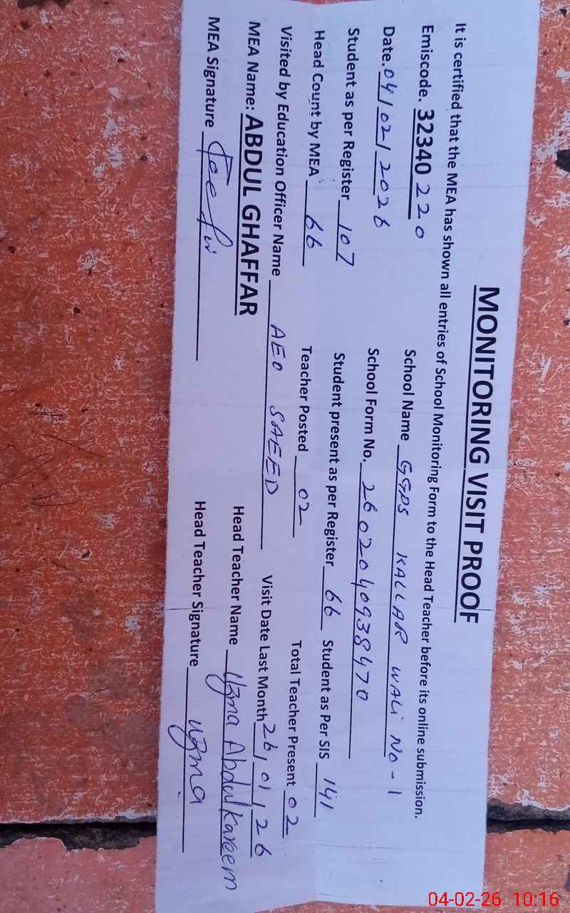 | EMIS Code: 32340220 | Name of School: GGPS KALLAR WALI NO. 1 | |||