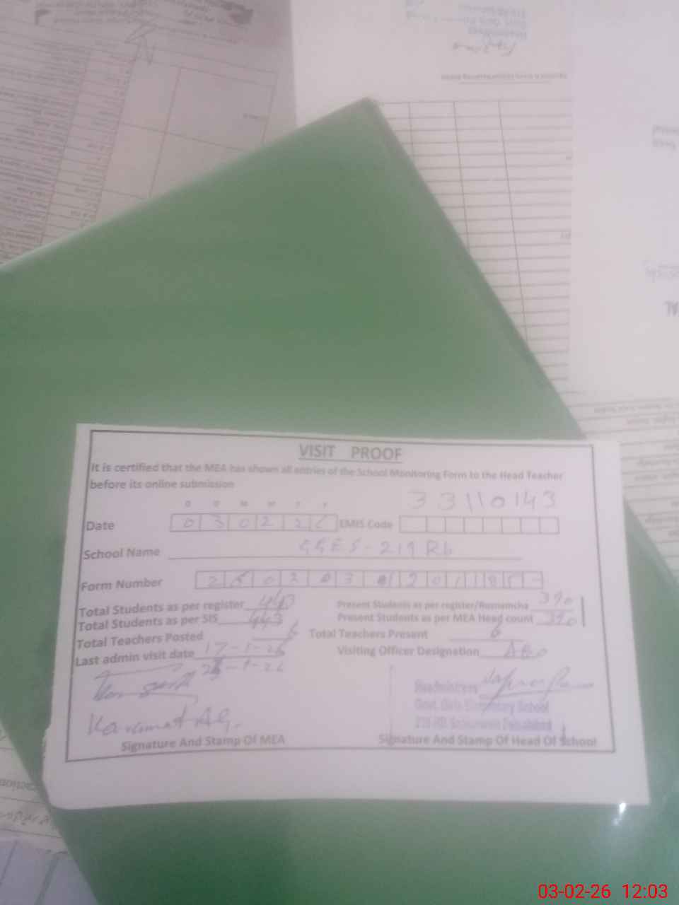 | EMIS Code: 33110143 | Name of School: GGES CHAK 219 RB SAHIANWALA | |||
