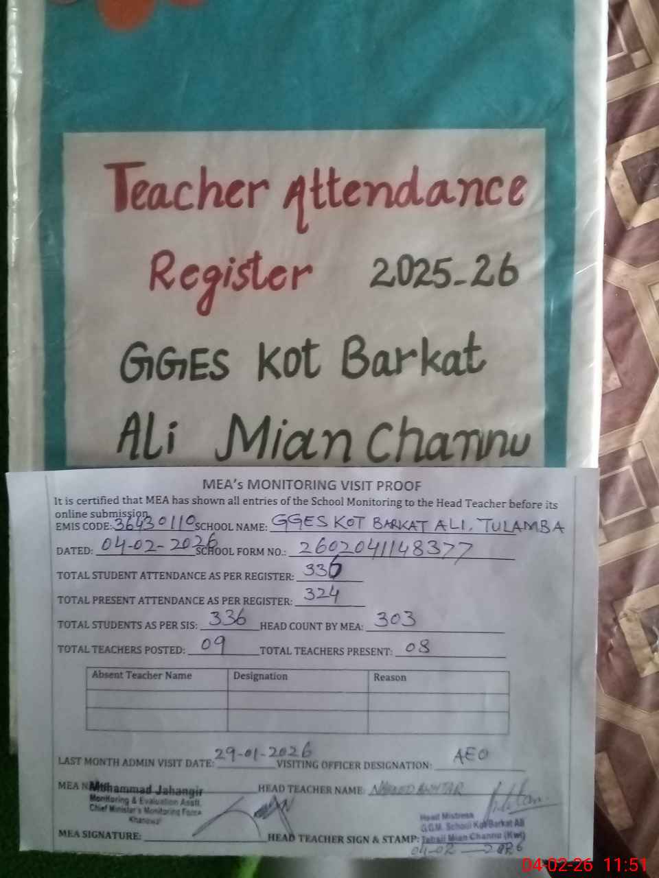 | EMIS Code: 36430110 | Name of School: GGES KOT BARKAT ALI, TULAMBA | |||