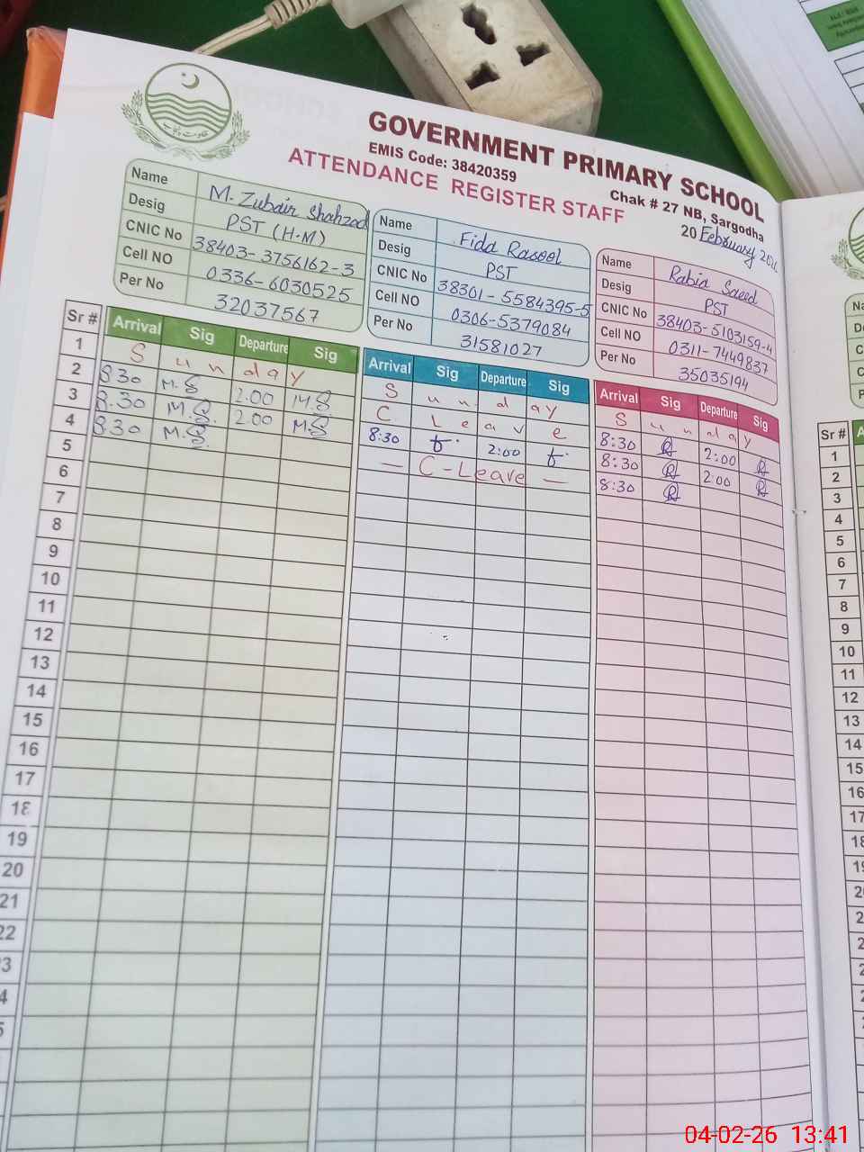 | CNIC | Full Name | Designation | R/C | Absence during last cal. month |