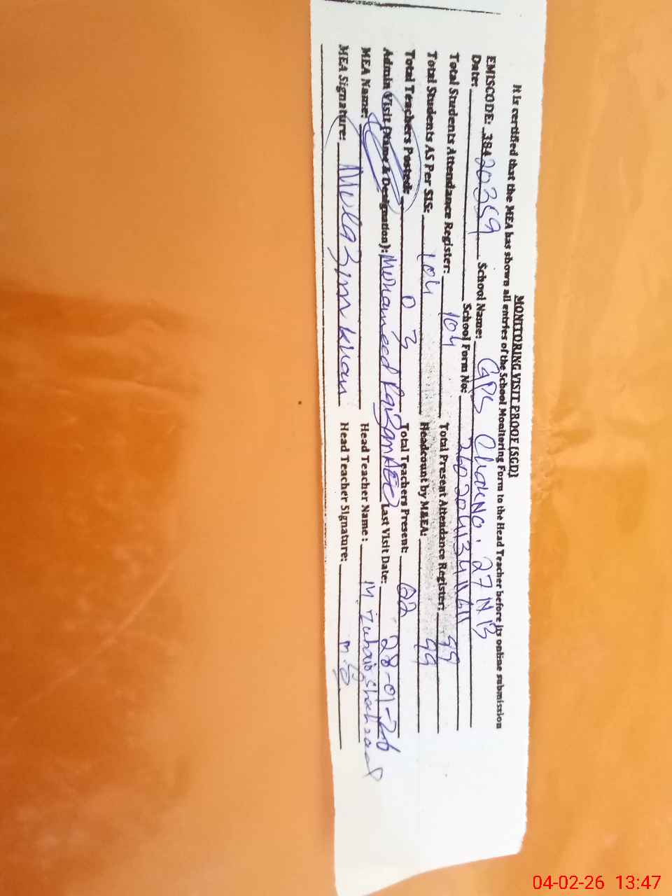 | Attendance Register | Head Teacher | MEA with School | Visit Proof |