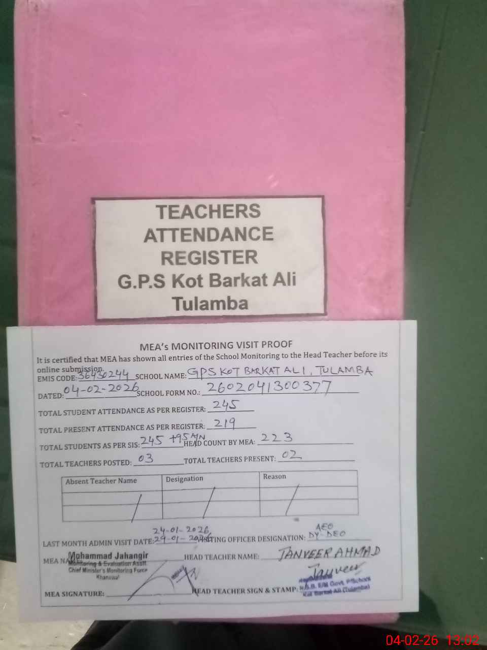 | EMIS Code: 36430244 | Name of School: GPS KOT BARKAT ALI, TULAMBA | |||