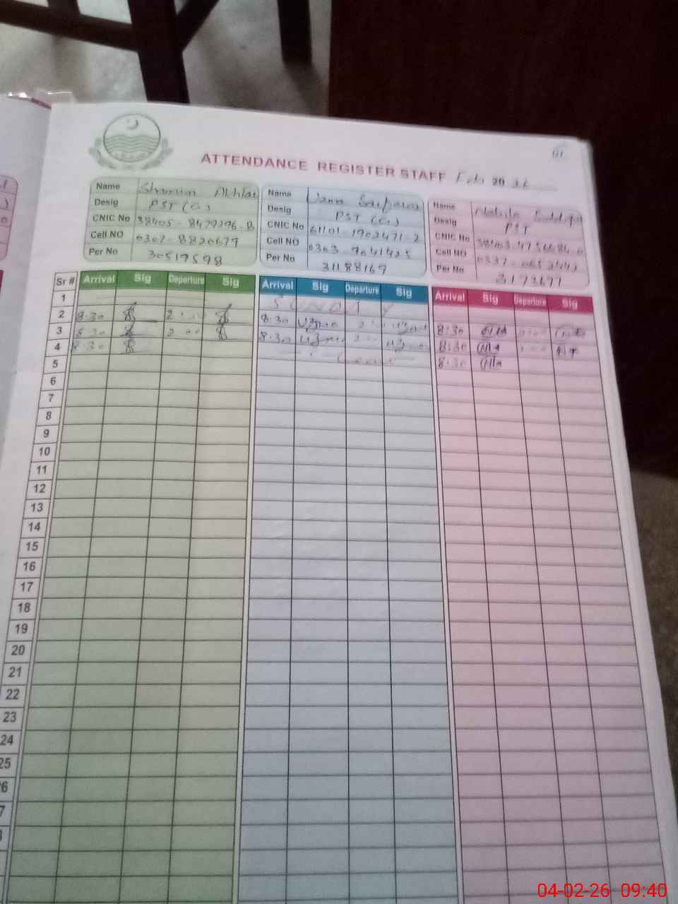 | CNIC | Full Name | Designation | R/C | Absence during last cal. month |