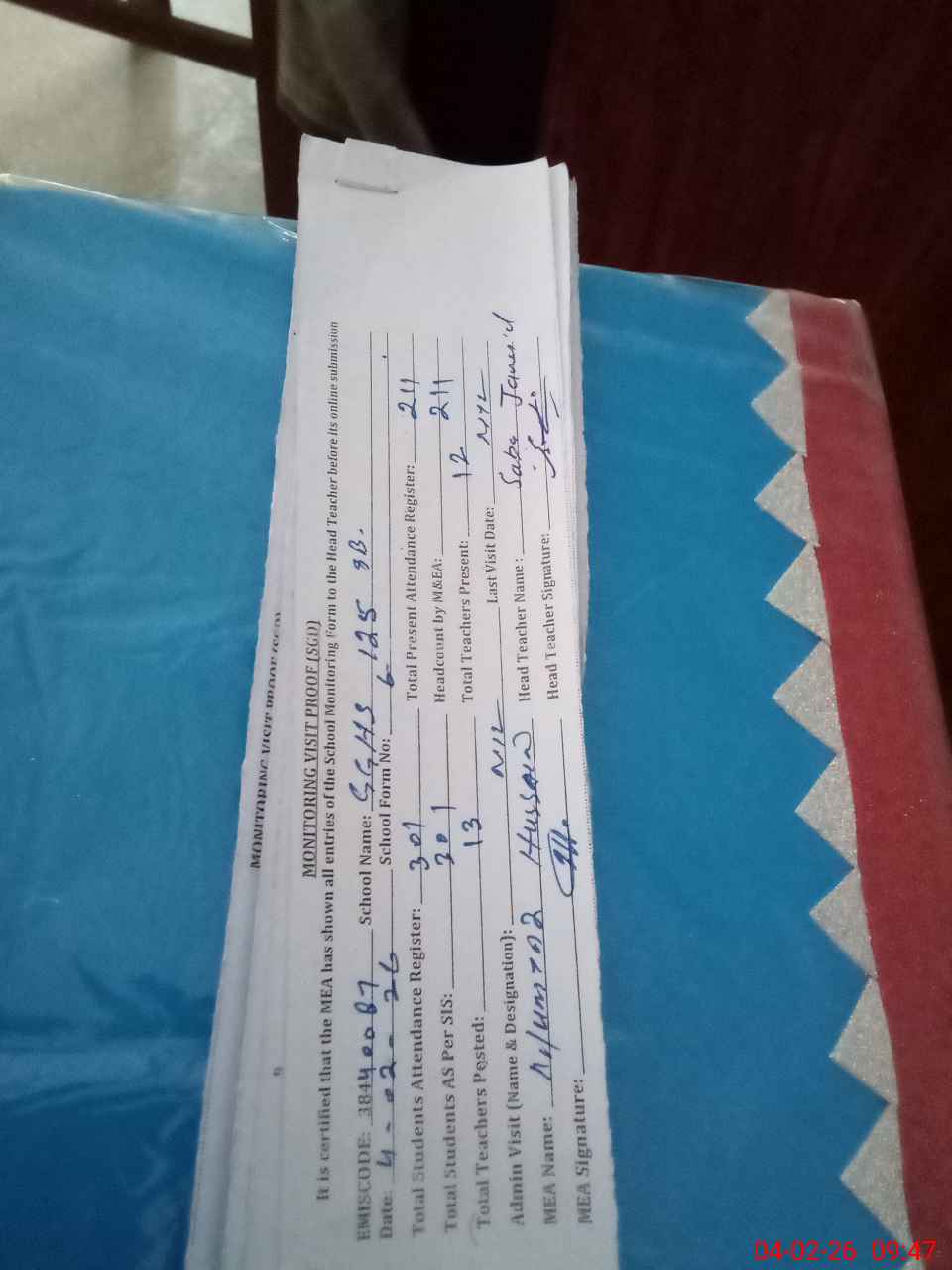 | Attendance Register | Head Teacher | MEA with School | Visit Proof |