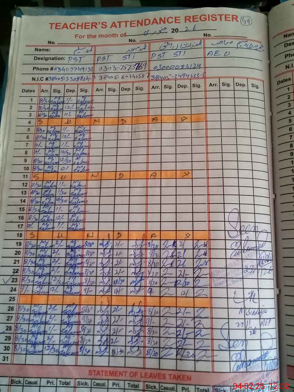 | Name: Mu**** Sa**** Designation: (School Headmaster's/Headmistress's) PST Phone/Cell Number: 03**** |