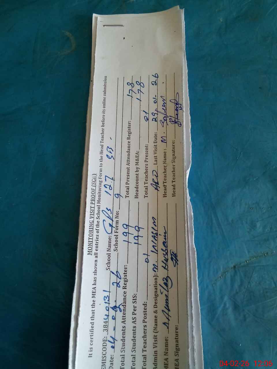 | Attendance Register | Head Teacher | MEA with School | Visit Proof |