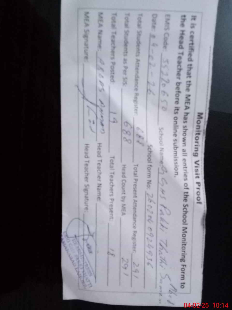 | Remarks (Use Separate Page if Required): Hand wash points broken is not repaired 01 toilet locked marked as nonfunctional declared toilet facility partial Boundary wall broken declared as partial Ayesha Bibi sweepress attendance column blank physically not present marked as unauthorized Teacher Shama Mehmood PST transferred out with manual authority since 04 years now authority letter is unavailable so marked as unauthorized students attendance is very low | |||||
