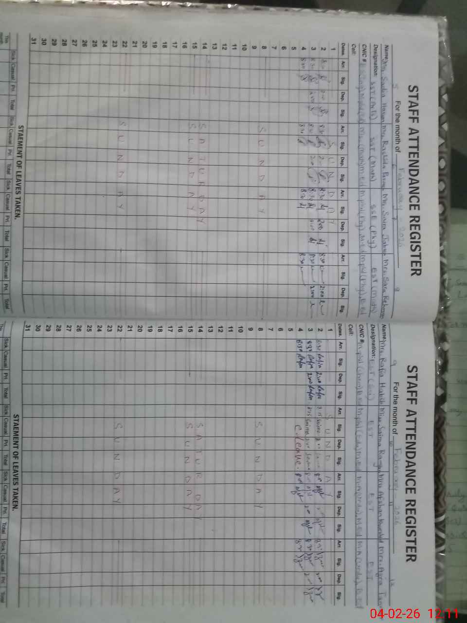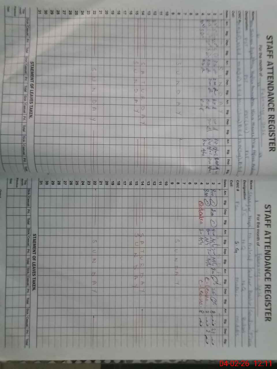 | CNIC | Full Name | Designation | R/C | Absence During Last Calender Month |