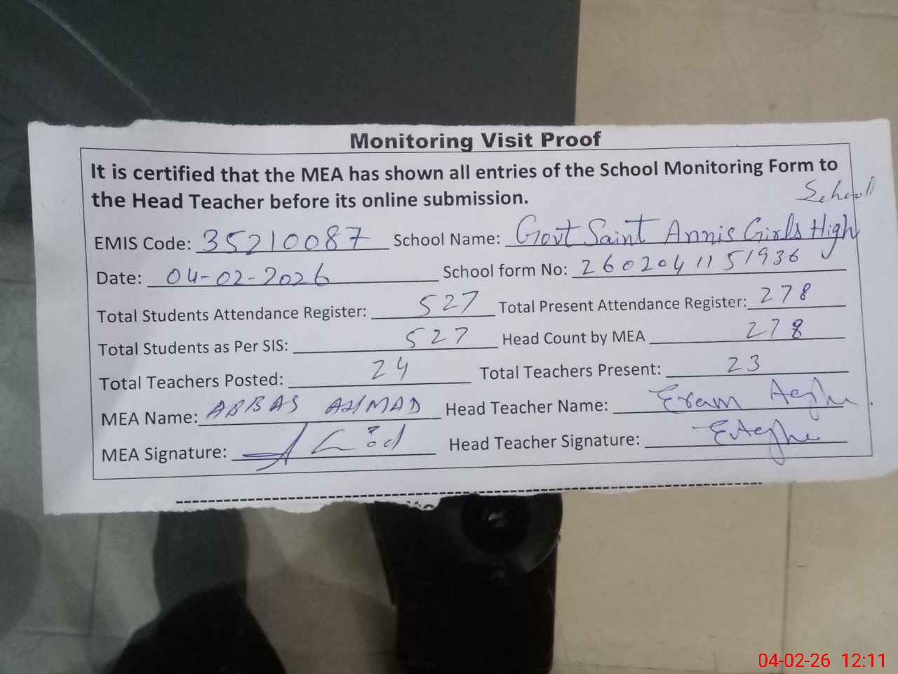 | Attendance Register | Head Teacher | MEA with School | Visit Proof |