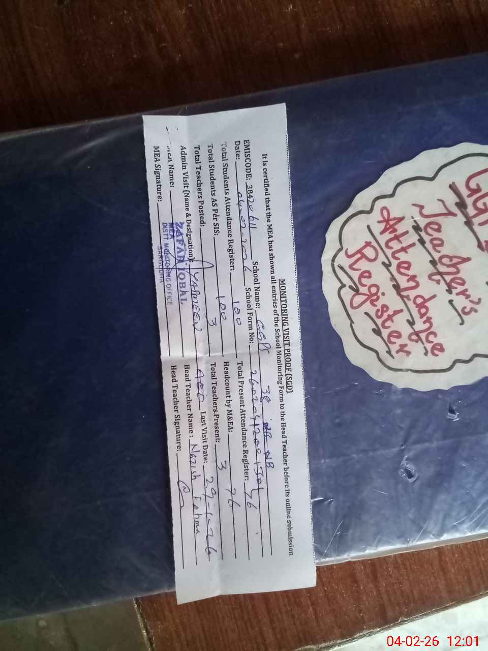 | Attendance Register | Head Teacher | MEA with School | Visit Proof |