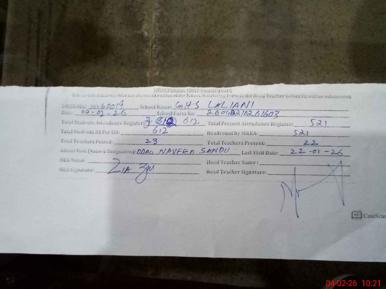 | Attendance Register | Head Teacher | MEA with School | Visit Proof |