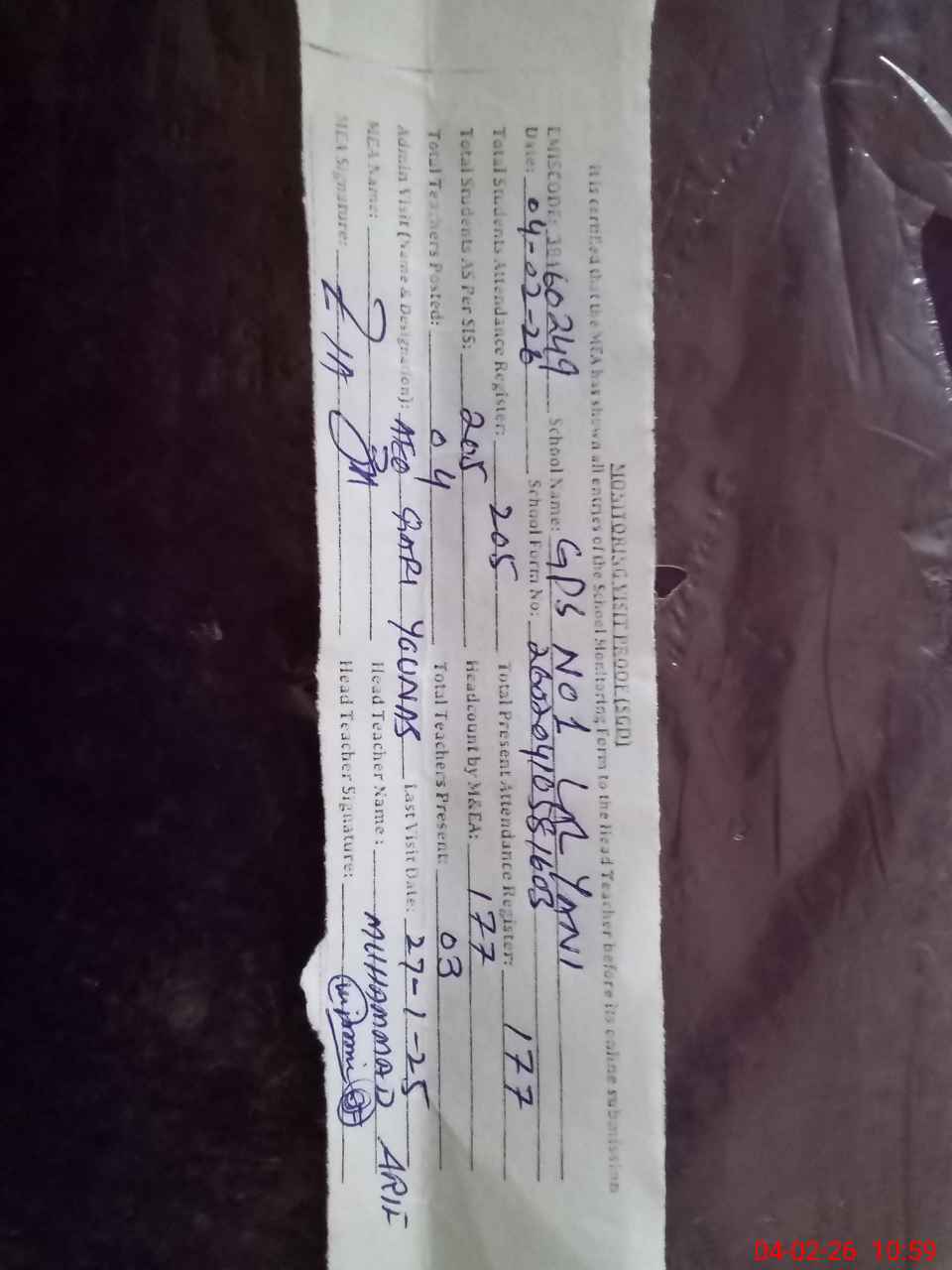 | Attendance Register | Head Teacher | MEA with School | Visit Proof |