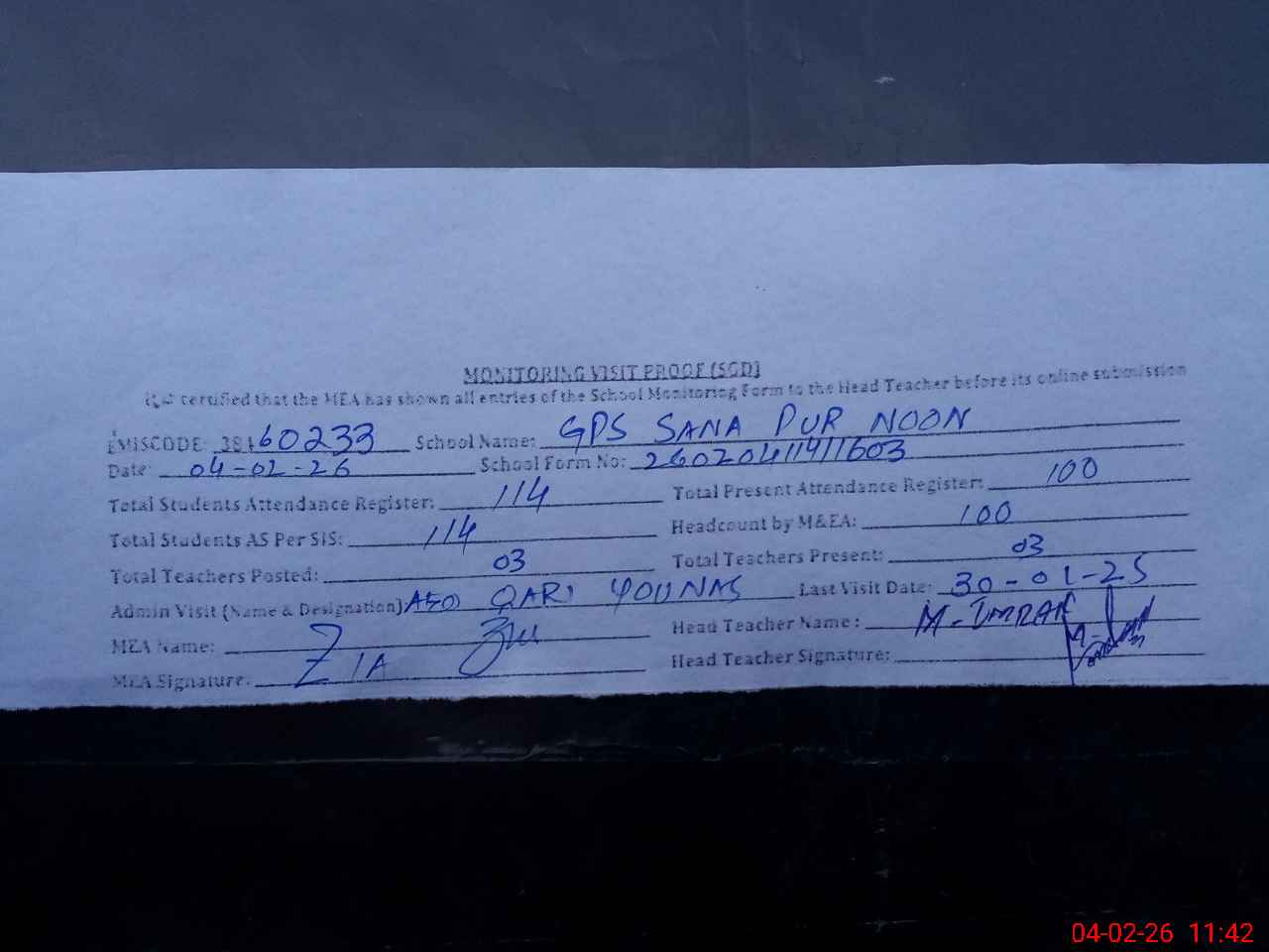 | Attendance Register | Head Teacher | MEA with School | Visit Proof |