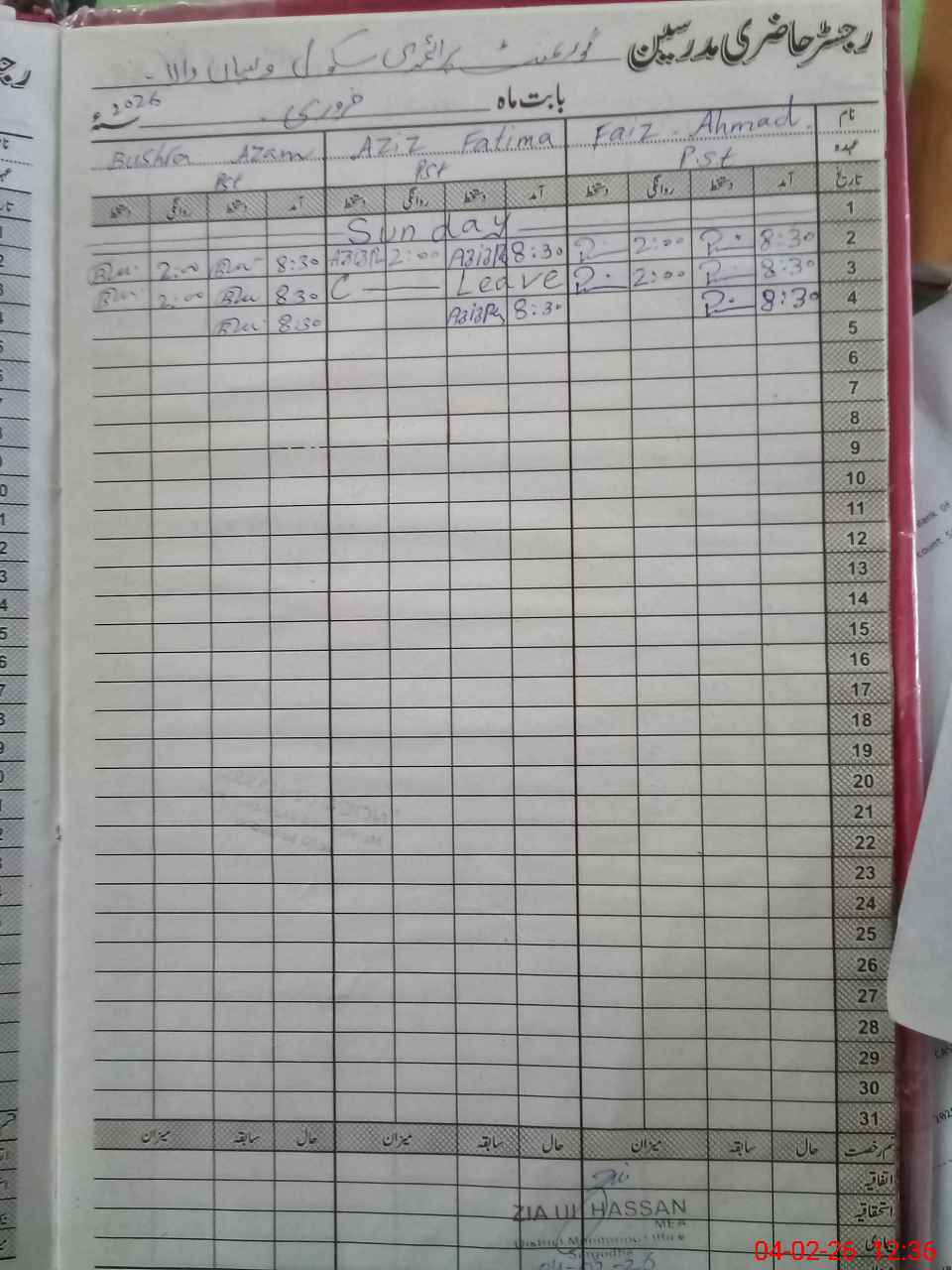 | CNIC | Full Name | Designation | R/C | Absence During Last Calender Month |