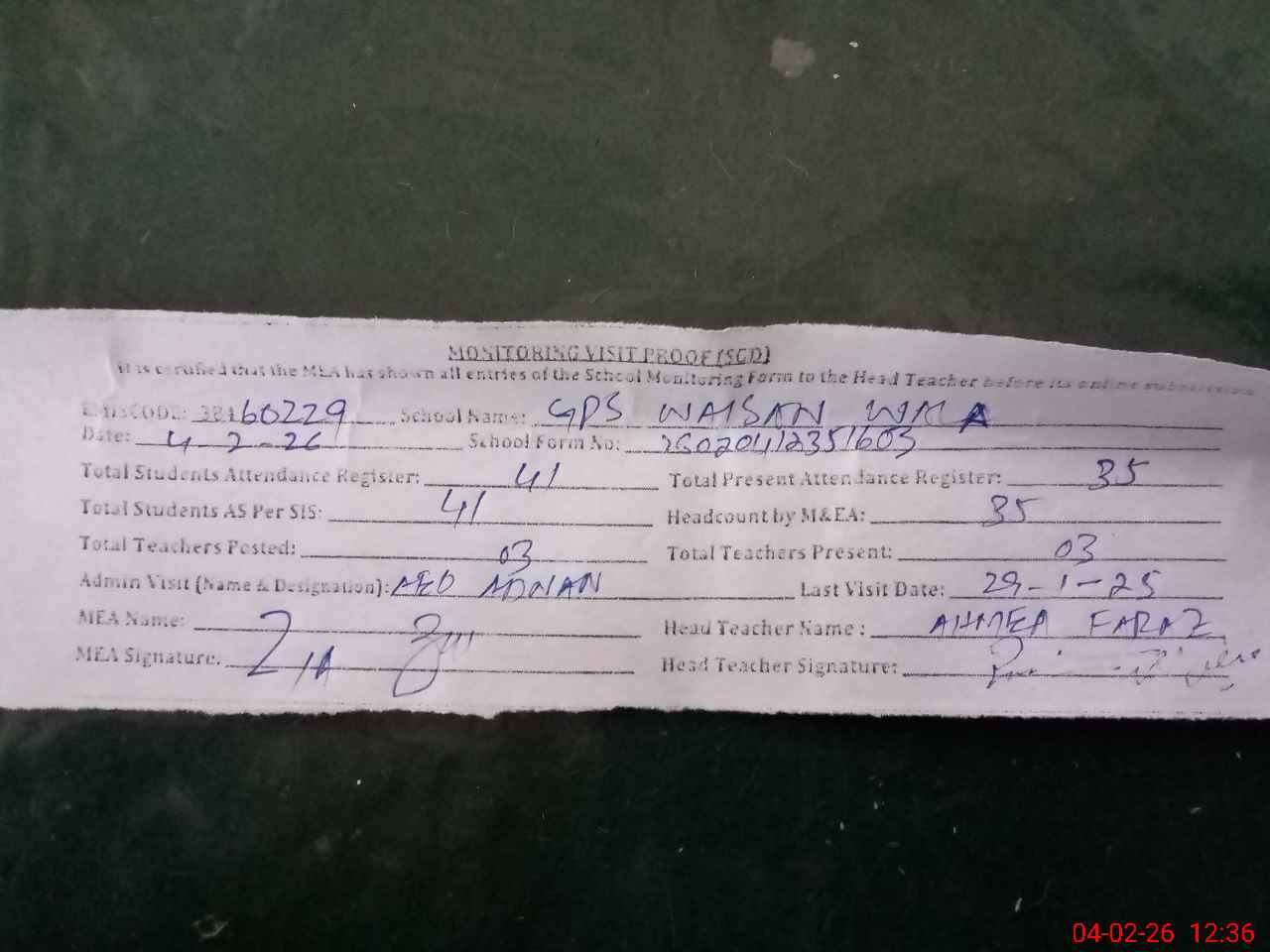 | Attendance Register | Head Teacher | MEA with School | Visit Proof |