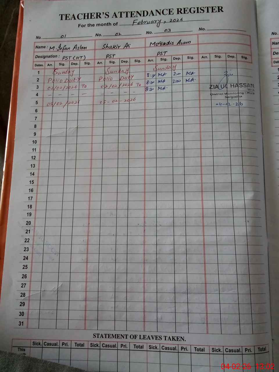 | Monitoring Date: 04-02-2026 | Start Time: 04-02-2026 12:43 PM | End Time: 04-02-2026 01:05 PM | Name of MEA: ZI**** ULHA**** | |