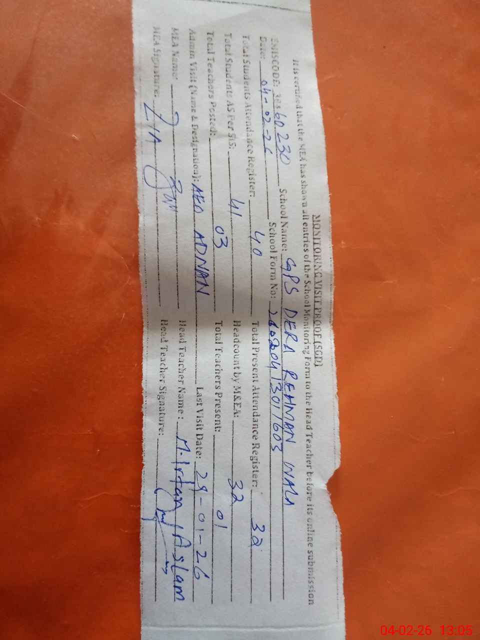 | Attendance Register | Head Teacher | MEA with School | Visit Proof |