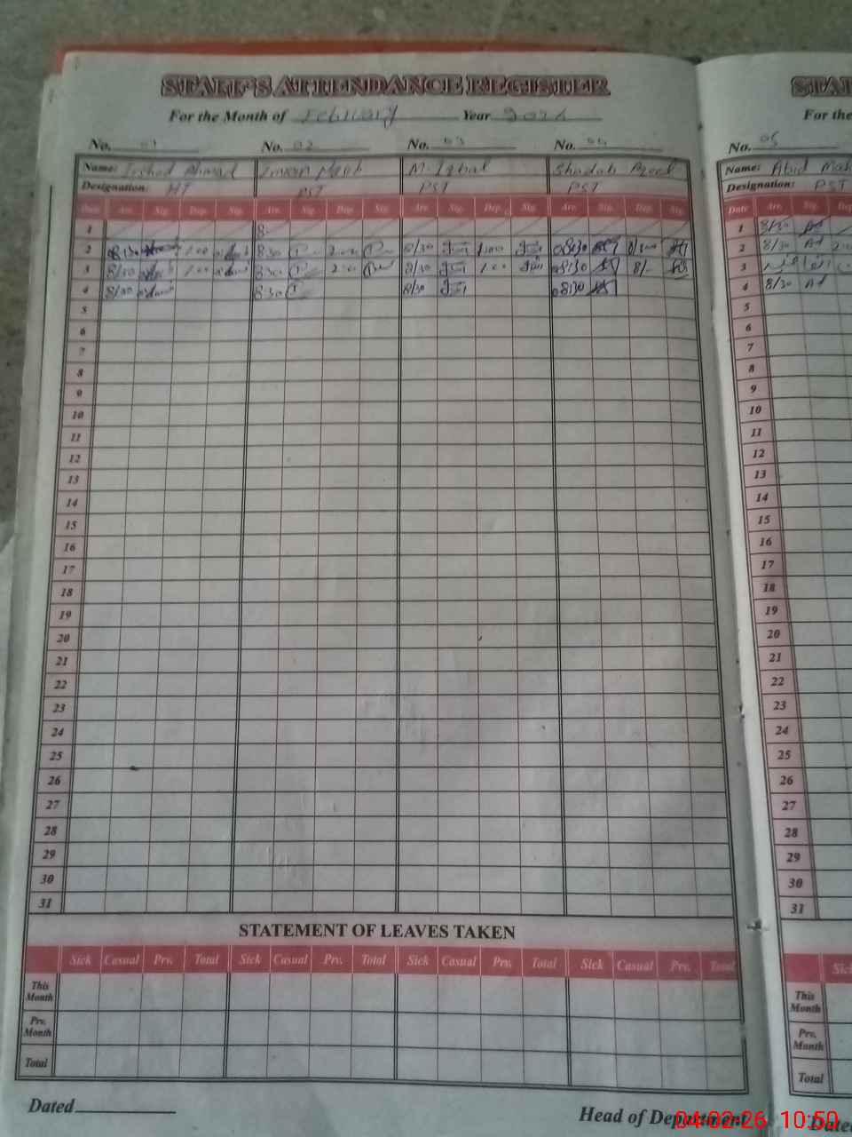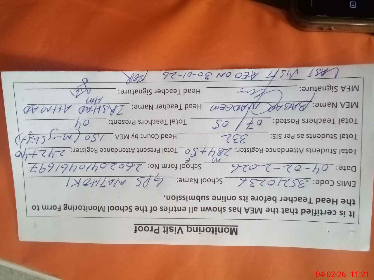 | Remarks (Use Separate Page if Required): 1 Irshad Ahmad Headmaster shown present on attendance register but not present in school so according to SOPs marked him absent 2 A difference of 92 students found less than roznamcha while headcounting of the morning shift classes 3 Class 7 in the afternoon session so does attendance not taken 3 NSB and FTF record registers nit updated for the month of January 2026 nor bank account statements available | |||||