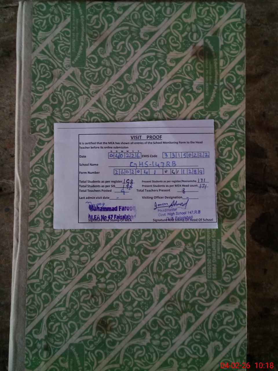 | Attendance Register | Head Teacher | MEA with School | Visit Proof |