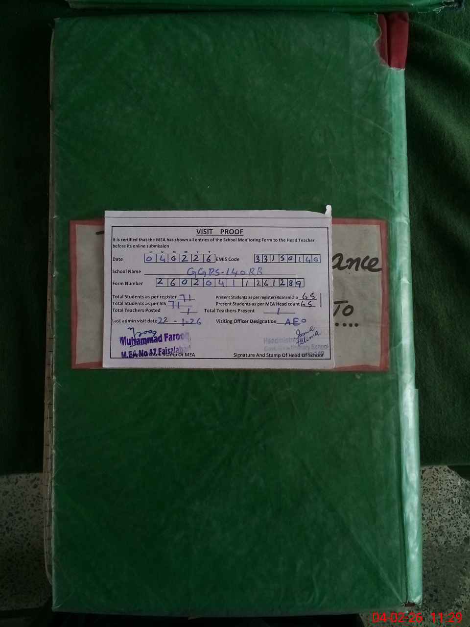 | Attendance Register | Head Teacher | MEA with School | Visit Proof |