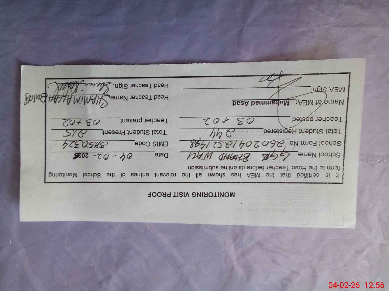 | Attendance Register | Head Teacher | MEA with School | Visit Proof |
