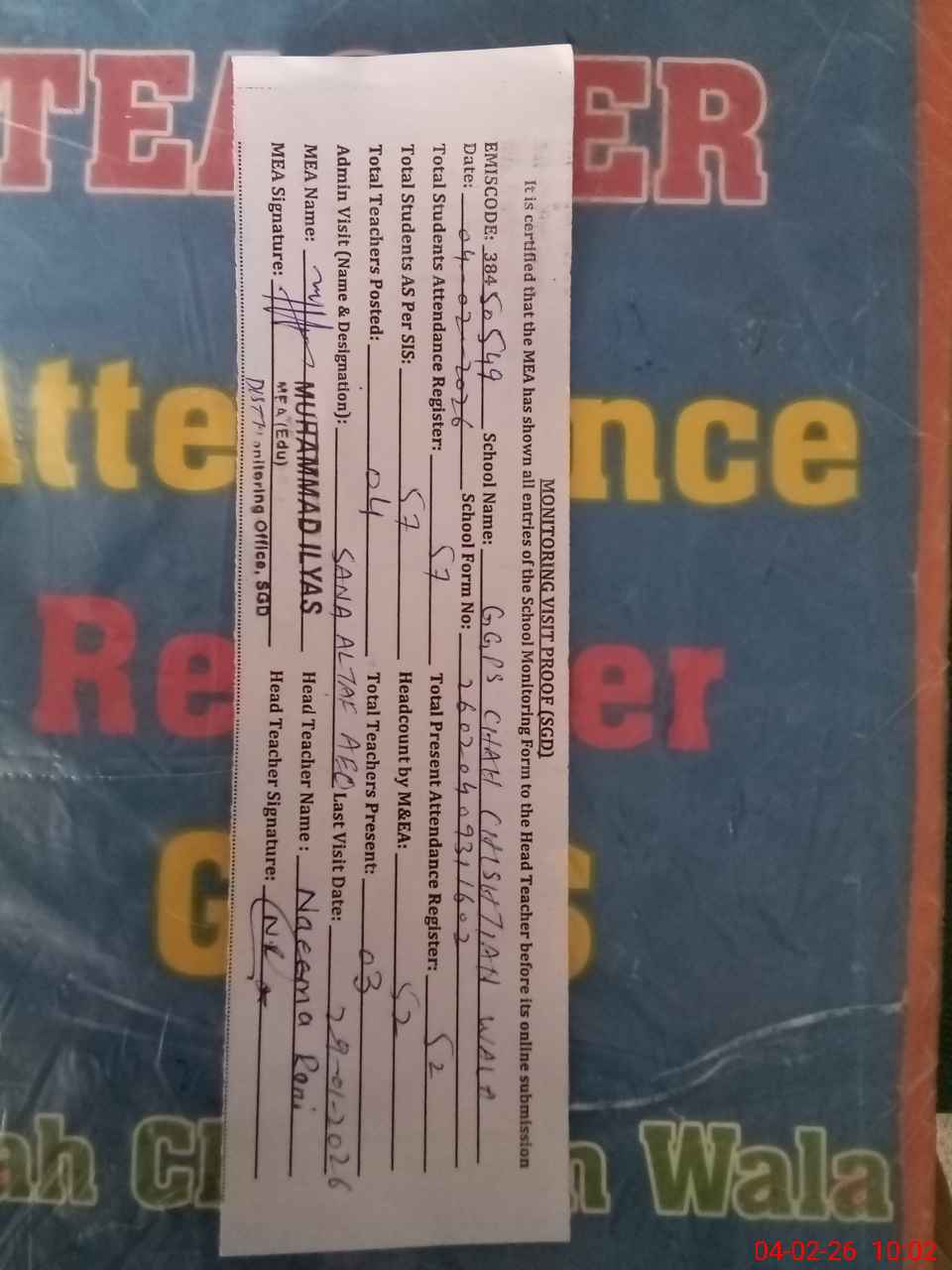 | Attendance Register | Head Teacher | MEA with School | Visit Proof |
