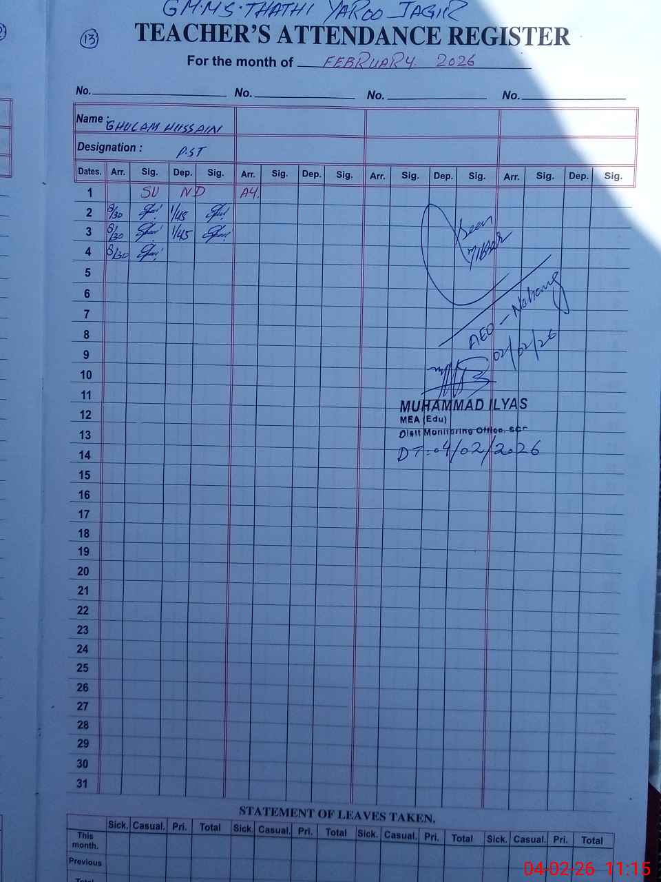 | Attendance Register | Head Teacher | MEA with School | Visit Proof |