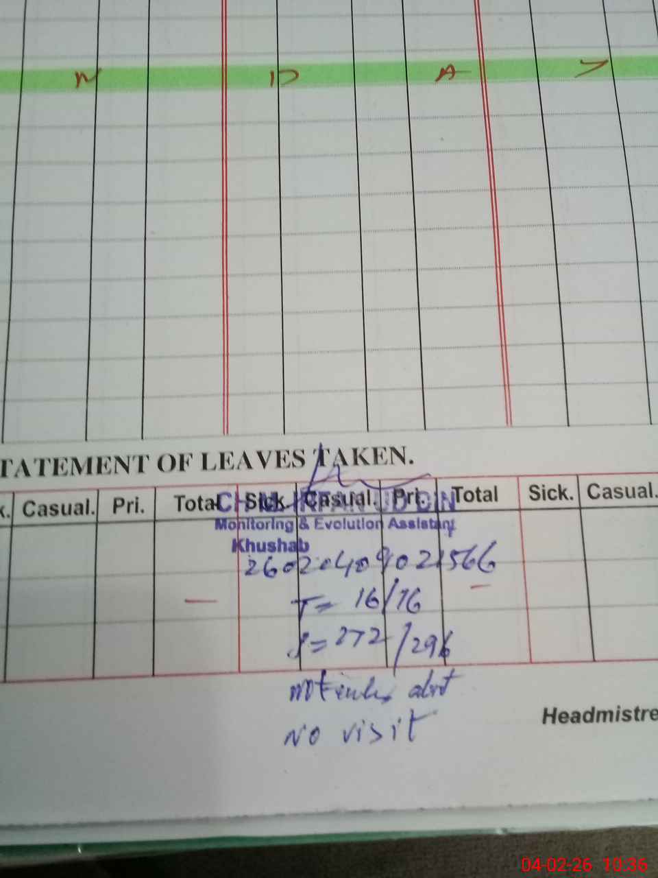 | Attendance Register | Head Teacher | MEA with School | Visit Proof |