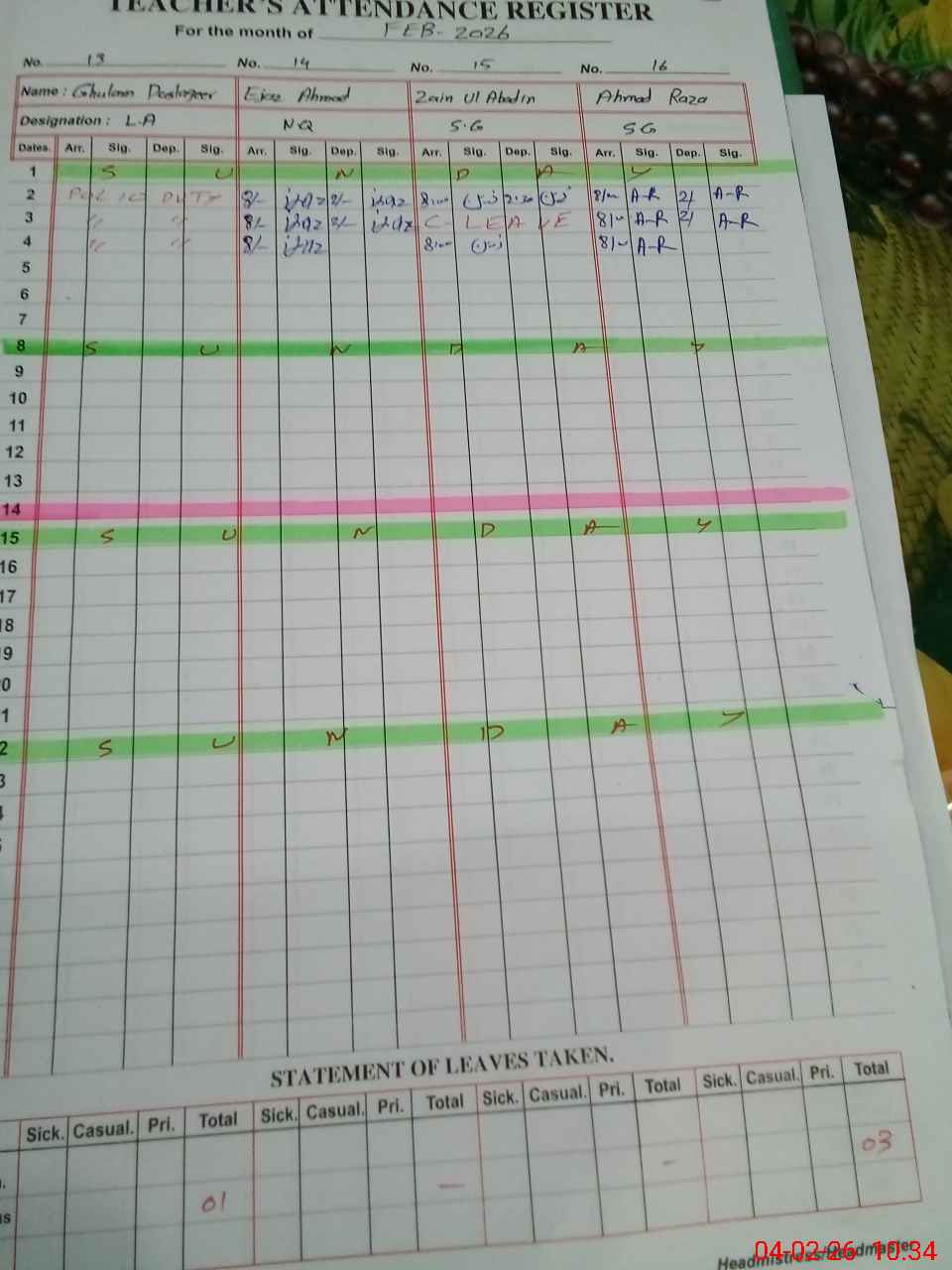 | Leave | Duty | Absent | Maternity | Medical | Ex- Pak |