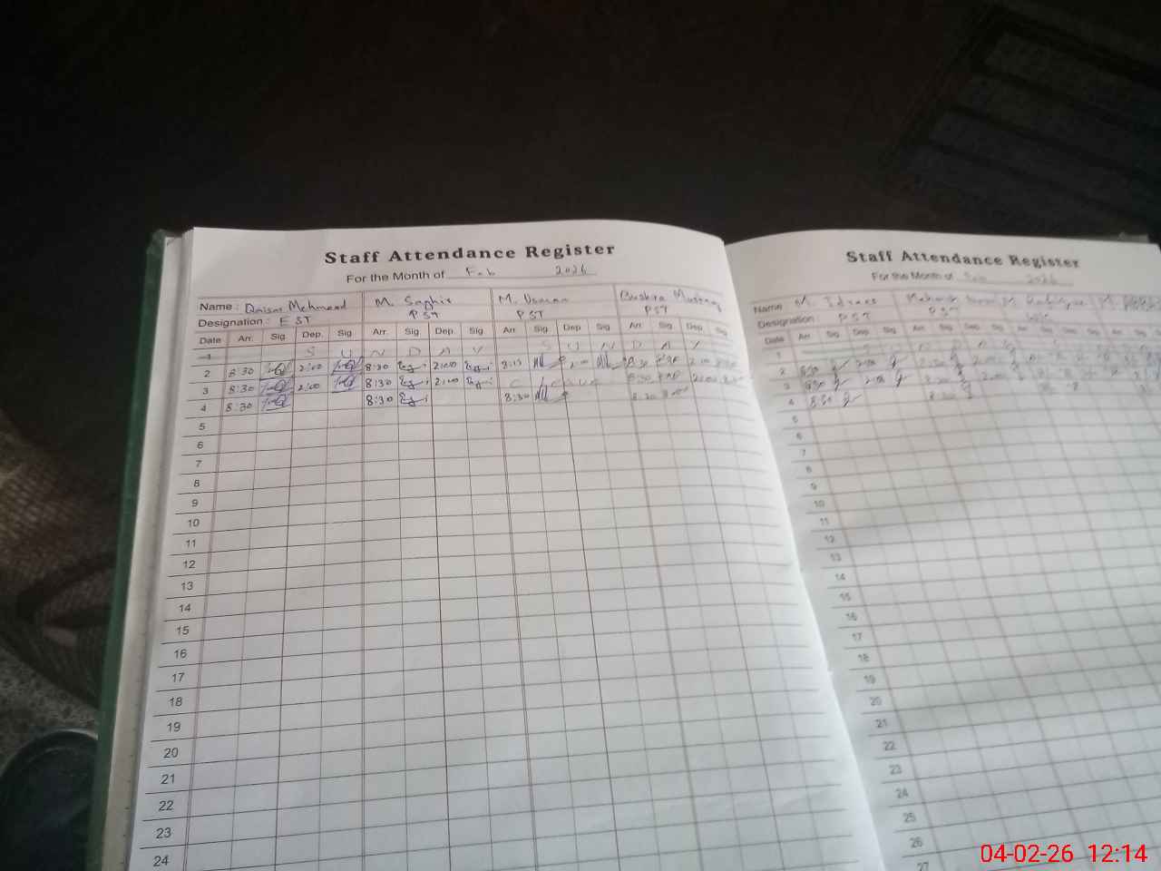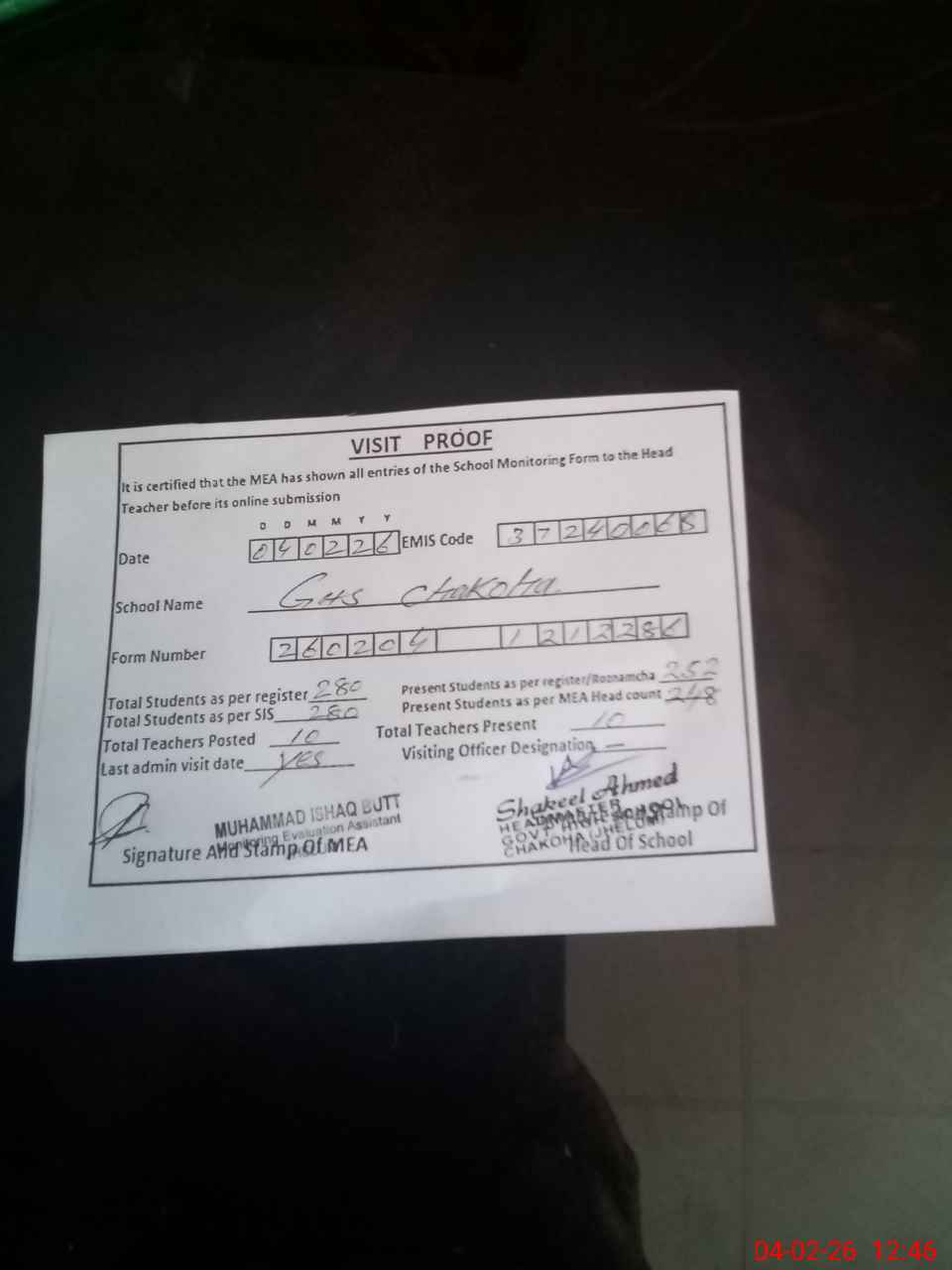 | Attendance Register | Head Teacher | MEA with School | Visit Proof |