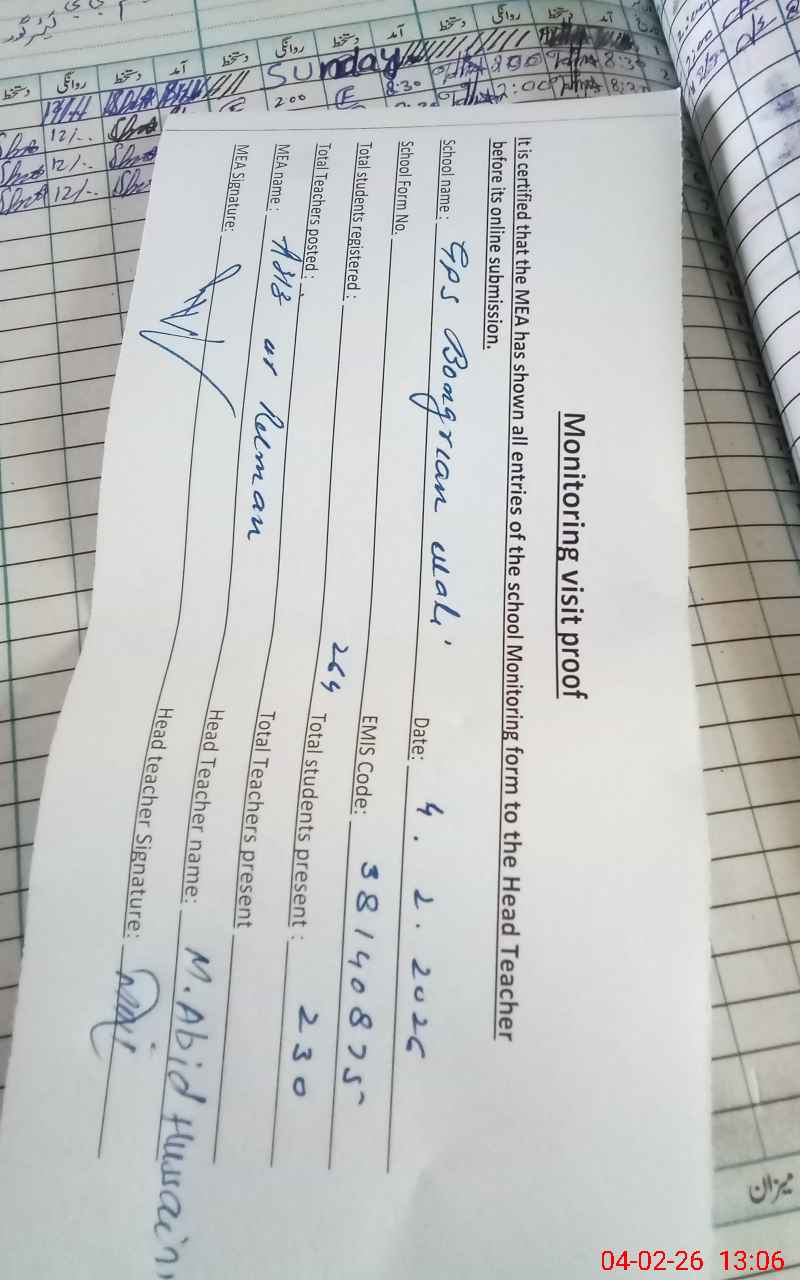 | Attendance Register | Head Teacher | MEA with School | Visit Proof |