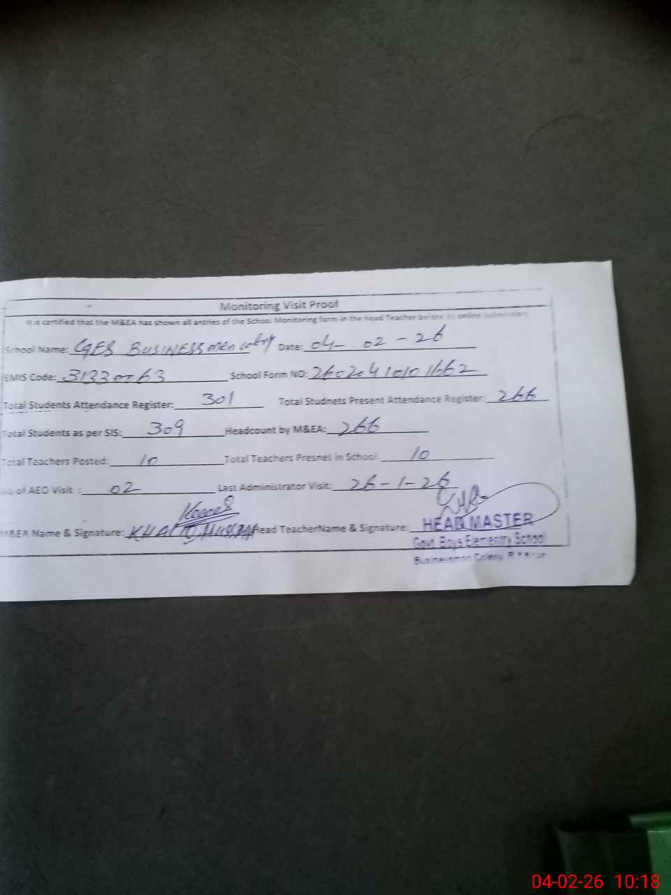 | Attendance Register | Head Teacher | MEA with School | Visit Proof |