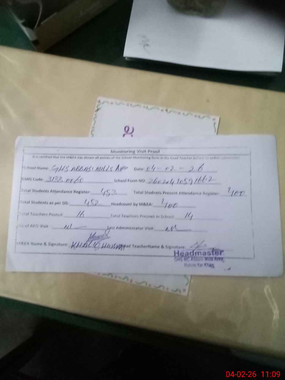 | Attendance Register | Head Teacher | MEA with School | Visit Proof |