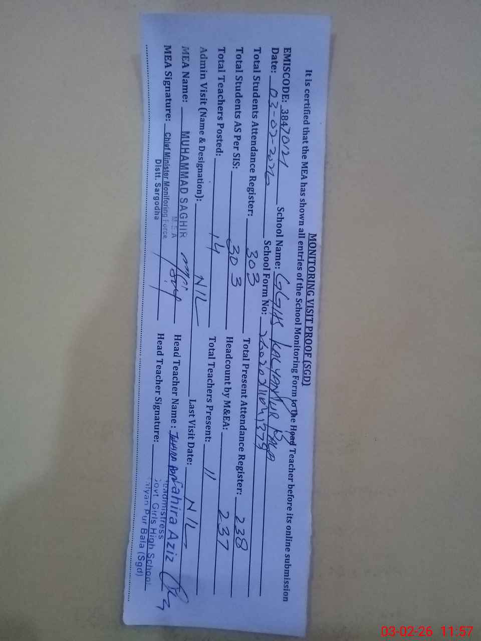 | Monitoring Date: 03-02-2026 | Start Time: 03-02-2026 11:04 AM | End Time: 03-02-2026 11:59 AM | Name of MEA: MU**** SA**** | |