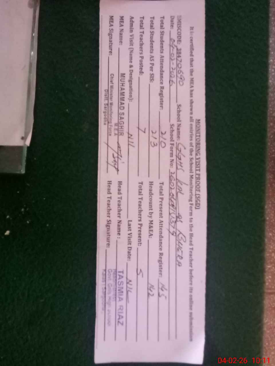 | Attendance Register | Head Teacher | MEA with School | Visit Proof |