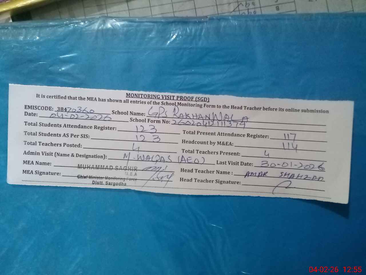 | Attendance Register | Head Teacher | MEA with School | Visit Proof |