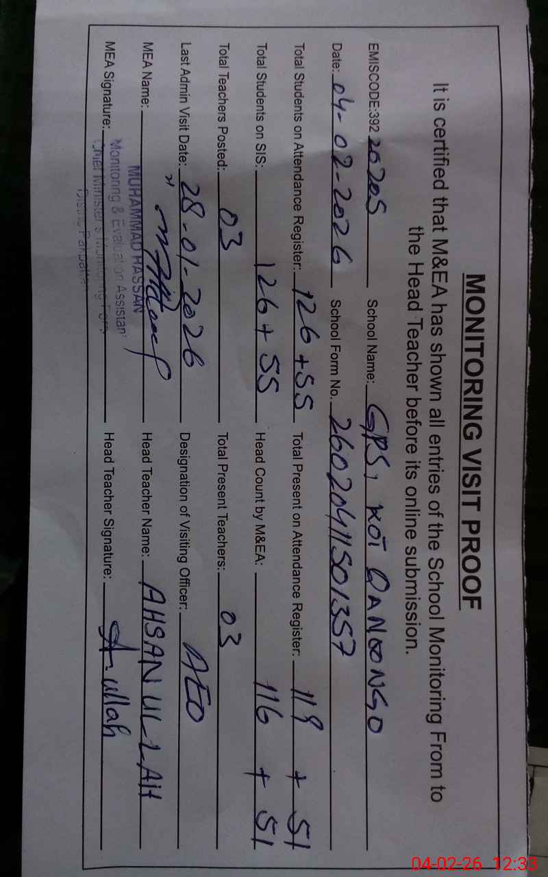 | EMIS Code: 39220205 | Name of School: GPS KOT QANOONGO P/O 22/E.B ARIF WALA | |||