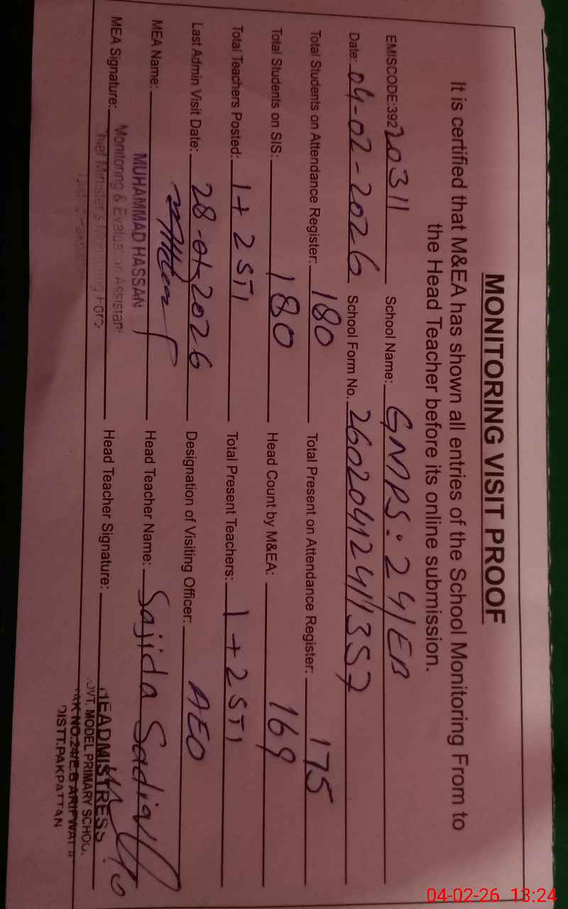 | Certified that this School was Inspected by the Undersigned MEA/DMO Today and the Information Stated Above is as Per Record. | |||||