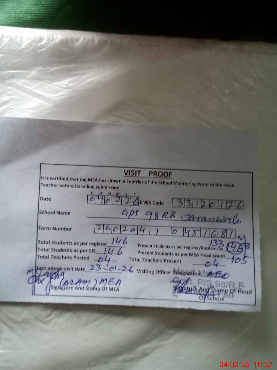 | Attendance Register | Head Teacher | MEA with School | Visit Proof |
