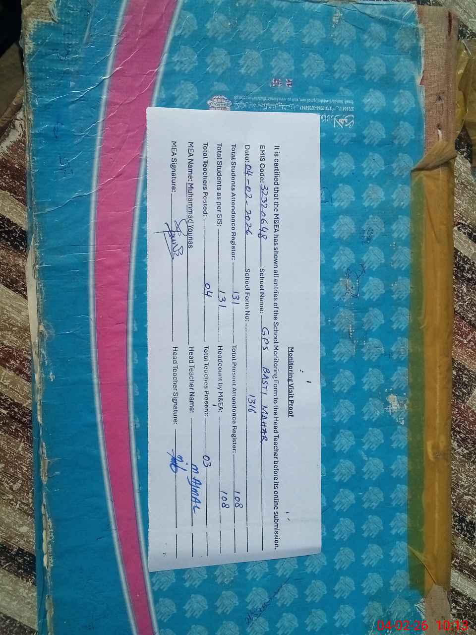 | Attendance Register | Head Teacher | MEA with School | Visit Proof |