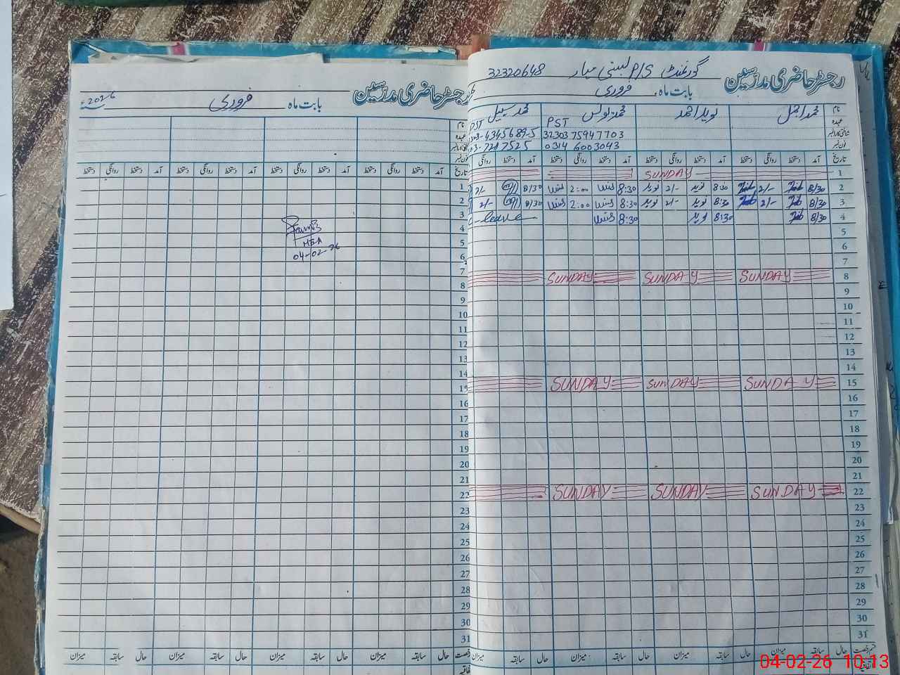 | CNIC | Full Name | Designation | R/C | Absence During Last Calender Month |