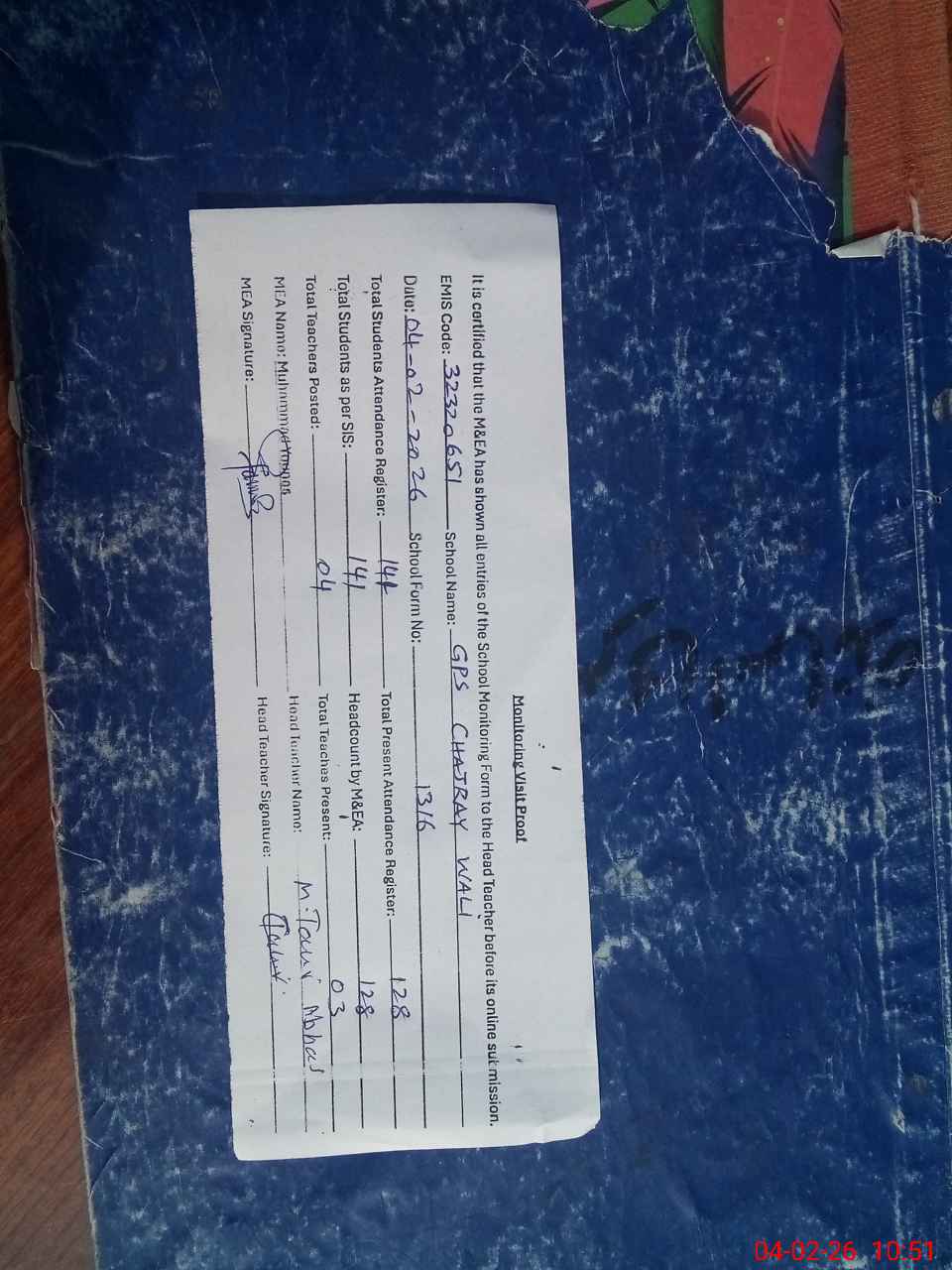 | Attendance Register | Head Teacher | MEA with School | Visit Proof |